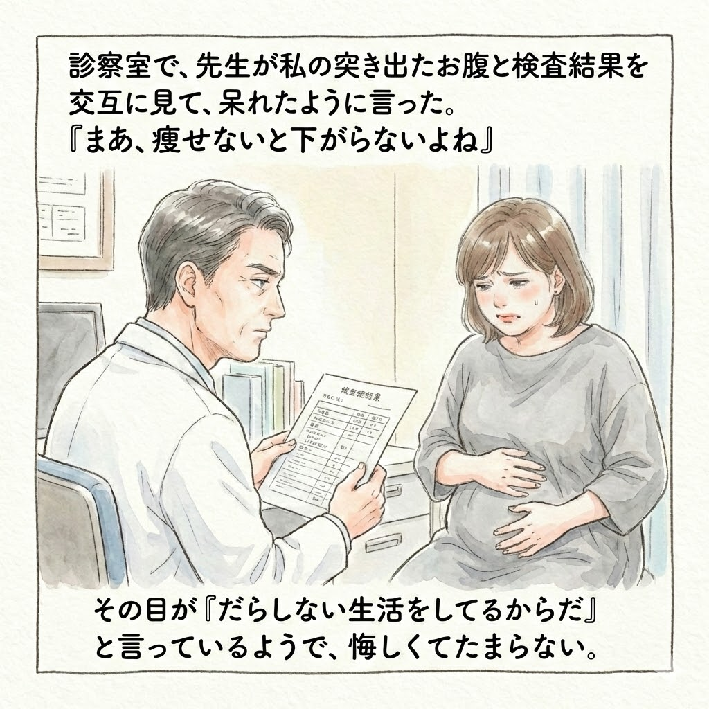 私の突き出たお腹と、異常値が並ぶ検査結果の紙を交互に見比べながら、ため息まじりに放たれた一言。
