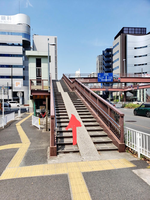 ○改札を出ましたら、西口側の天井が光る階段を目印に進みます。