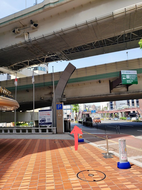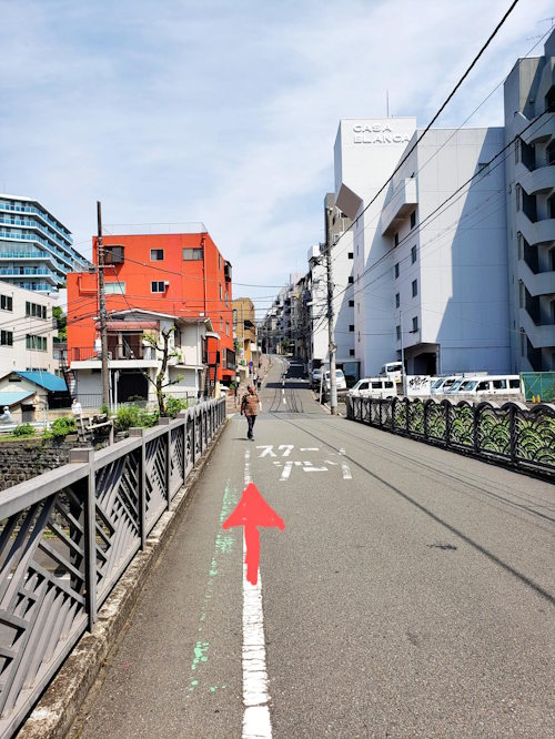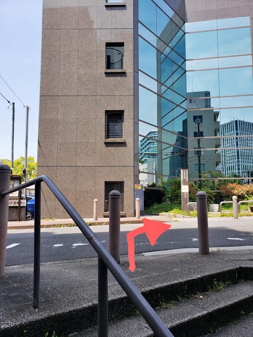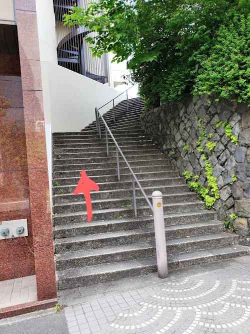 ○階段を上がるとホテルキャメロットジャパンが左に見えますこの道を直進します。