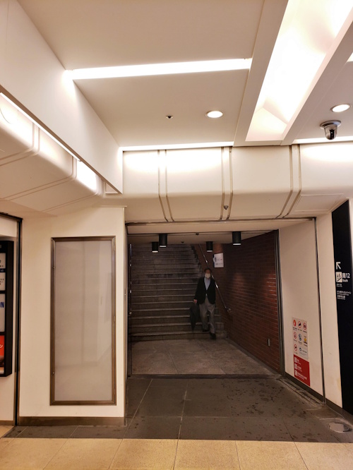 ○階段をおりたら直進します。少し歩くと左側に階段があります。